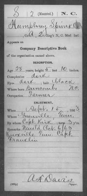Humphrey Sprinkle was born in Buncombe County, NC on June 8, 1834. Much like my ancestor, Jacob Nowell (previously covered in this blog), Humphrey originally enlisted in the Confederate Army. Unlike Jacob, Humphrey wasn't captured, but rather deserted from the Confederate Army. On July 15, 1862, Humphrey Sprinkle enlisted as a Private in Company D, North Carolina 64th Infantry Regiment. He was 27 years old.